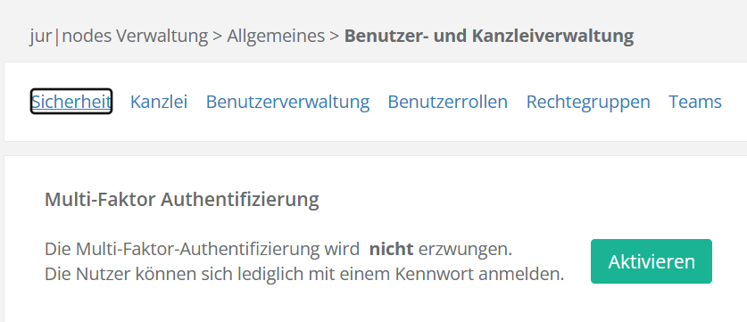 Im Bereich „Verwaltung“ können Sie global erzwingen, dass alle Benutzer Ihres Servers weitere Authentifizierungsmethoden hinterlegen müssen. Navigieren Sie hierzu zu „Verwaltung“ – „Allgemeines“ – „Kanzlei & Benutzer“ – Reiter „Sicherheit“ und aktivieren Sie die die Multi-Faktor-Authentifizierung mit Hilfe des grünen Buttons „Aktivieren“: