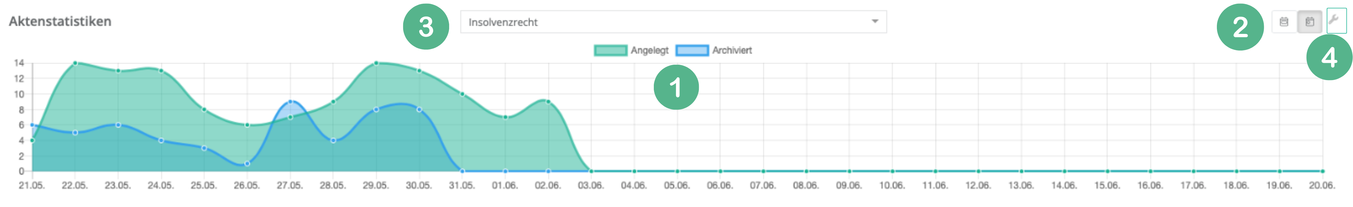 2.) Über die Kalenderblätter-Buttons im oberen rechten Bereich können Sie eine tageweise oder auf Monaten basierende Darstellung der Aktenstatistiken wünschen.