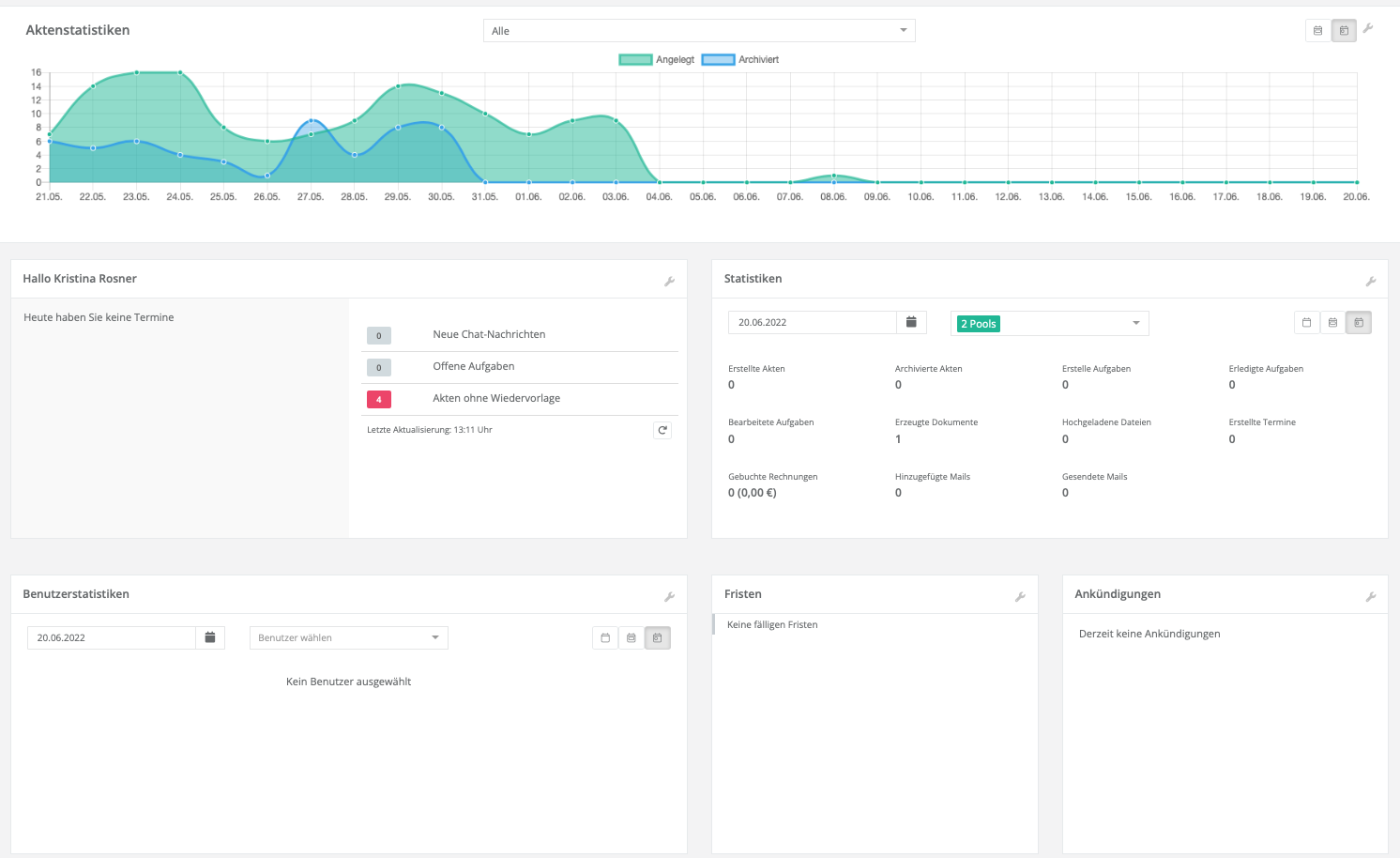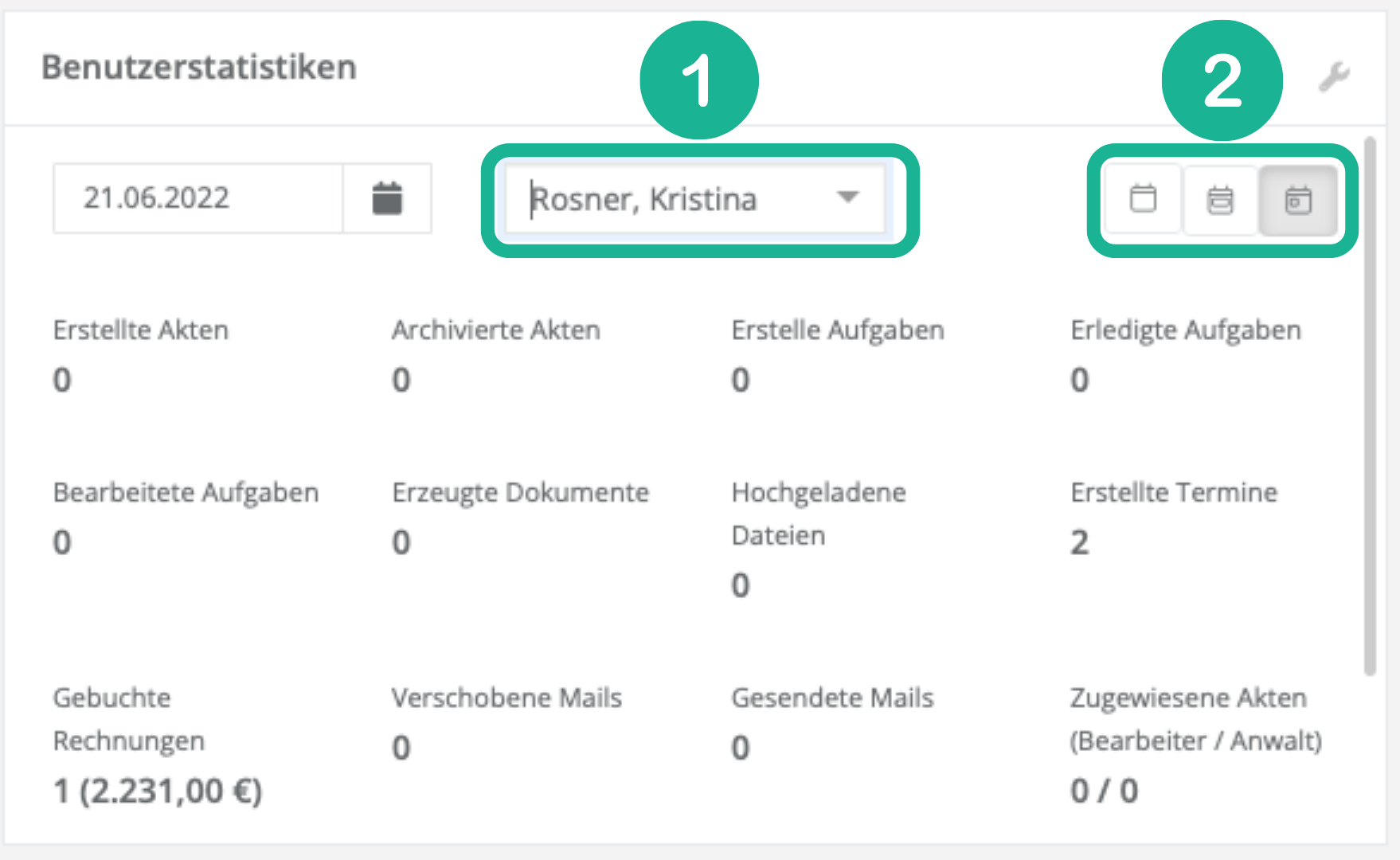 Das Benutzerstatistiken-Panel ist das Pendant zum unter 1.3 vorgestellten Statistiken-Panel. Auch in diesem Panel erhalten Sie einen Überblick über die wichtigsten KPIs, wie erstellte Akten/Aufgaben/Termine/Dokumente etc.