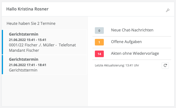 Das Dashboard soll Ihnen einen schnellen Überblick über Ihren Kanzleiablauf ermöglichen. Je nach Benutzerrolle unterscheidet sich aber die Notwendigkeit der Darstellung unterschiedlicher Informationen. Daher lassen sich die Ansichten Ihres Dashboards für jeden Benutzer mit Hilfe sogenannter Panels individualisieren. Deren Anordnung und Nutzung ist völlig frei konfigurierbar.
