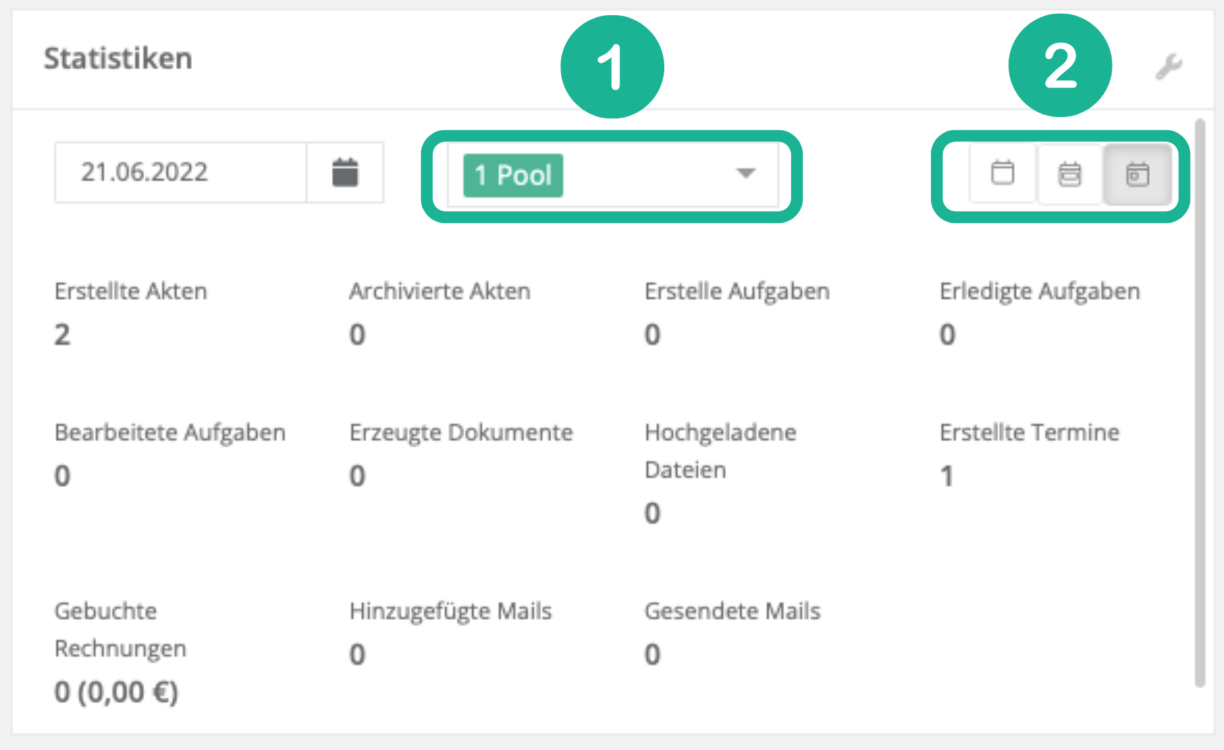 Mit Hilfe des Statistiken-Panels lassen sich sehr schnell einfache Datenpool-übergreifende Auswertungen machen. Sie erhalten einen Überblick über die erstellten Akten/Aufgaben/Termine/Dokumente/Dateien/Mails und Rechnungen inkl. Rechnungsbetrag.
