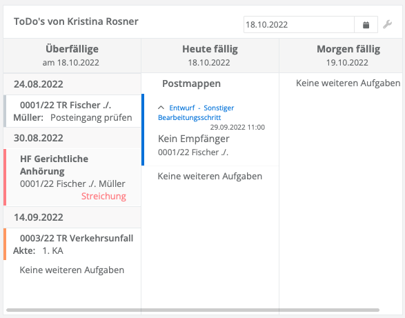 Im To-Do’s Panel erhalten Sie einen zeitbezogenen Überblick über alle fälligen Aufgaben, Vorfristen und Hauptfristen.