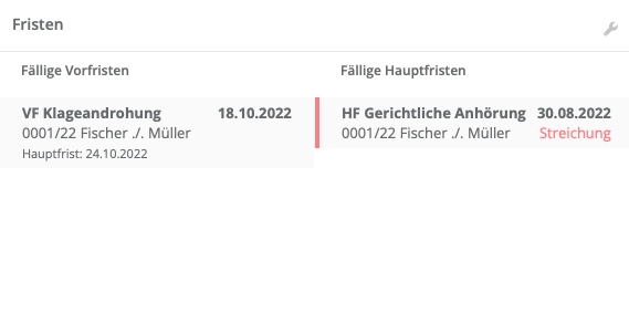 Im Fristen-Panel erhalten Sie einen Überblick über die Ihnen zugewiesenen Fristen. Zur besseren Differenzierung von Vorfristen und Hauptfristen ist das Panel zweigeteilt und unterschiedlich farblich markiert: auf der linken Seite finden Sie die Vorfristen in orange. Auf der rechten Seite sind die Hauptfristen in rot.