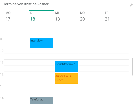 Im Termine-Panel erhalten Sie einen Überblick über Ihre Termine der aktuellen Woche. Diese sind, ebenso, wie in Ihrer Kalender-Ansicht farblich gekennzeichnet. Es ist immer die aktuelle Woche eingestellt, diese lässt sich nicht variieren.
