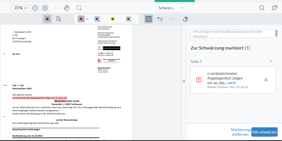 Durch Klick auf den Button „Alle schwärzen“ werden die markierten Stellen geschwärzt.