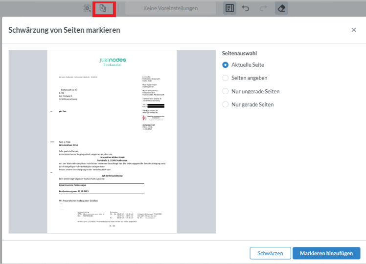 Auch für das Schwärzen gilt, dass diese Änderung bis zum Betätigen des „PDF-Speichern“-Buttons nur vorübergehend ist.