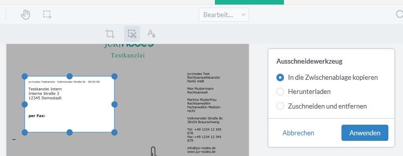 Mit dem Ausschneidewerkzeug können Sie bestimmte Bereiche der PDF-Datei ausschneiden und in die Zwischenablage kopieren/herunterladen/zuschneiden und entfernen –> Anwenden