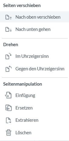 Es öffnet sich das folgende Menü, durch welches Seiten verschoben, gedreht, eingefügt, ersetzt, extrahiert oder gelöscht werden können:
