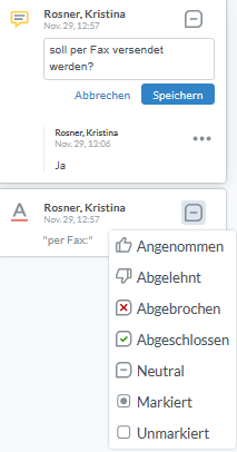 So können Sie bspw. auch auf die Kommentare Ihrer KollegInnen reagieren (antworten, annehmen etc.), wie in folgendem Screenshot zu sehen:
