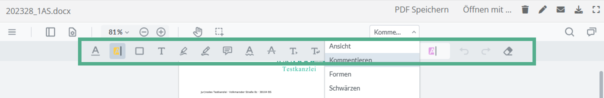 Für die umfassende Bearbeitung einer PDF-Datei stehen Ihnen nun folgende Mechanismen zur Verfügung, die Sie über das Drop-Down-Menü auswählen. Wenn eine andere Auswahl als die „Ansicht“ getroffen wird, erscheint eine weitere Navigation darunter. Diese beinhaltet die Unterfunktionen der jeweils angewählten Kategorie, wie in folgendem Beispiel (Kommentieren):