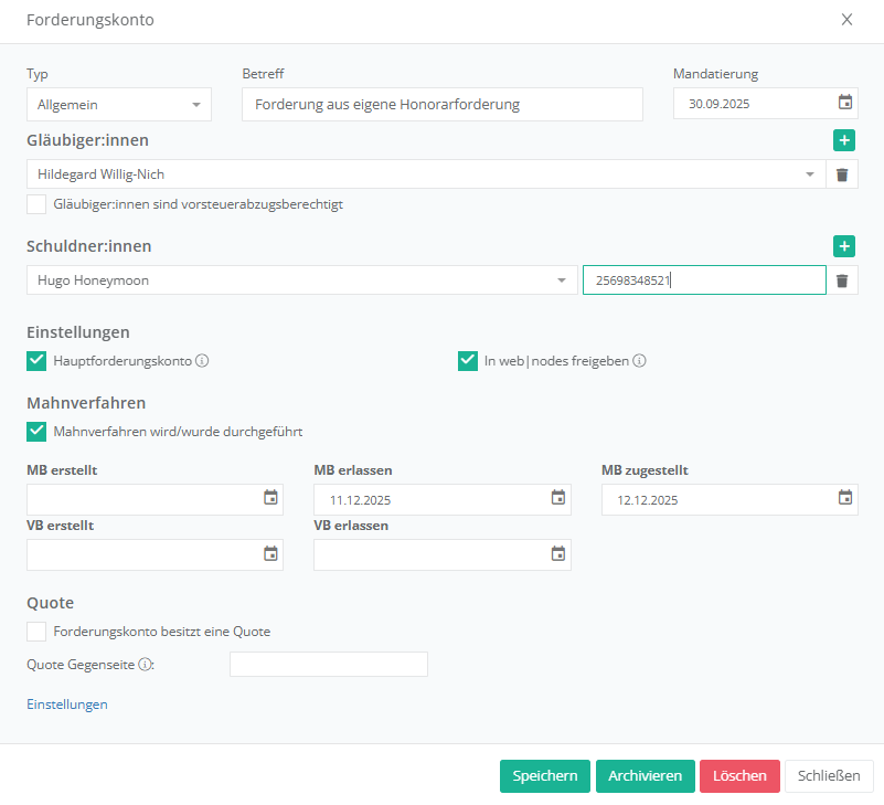 Den Widerspruch gegen einen Mahnbescheid Ihres Mandanten können Sie – wie alle anderen EDA-Maßnahmen auch – über das Forderungskonto erzeugen. Hierzu legen Sie zunächst ein FoKo in der entsprechenden Akte an. Nutzen Sie hierbei die Stammdaten aus dem Mahnbescheid hinsichtlich Antragsteller und Antragsgegner. Ihr Mandant befindet sich somit auf der „Schuldner“-Seite.