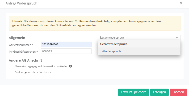 Tragen Sie das Geschäftszeichen des Zentralen Mahngerichts ein, machen Sie ggfs. weitere Angaben zur Anschrift oder eines gesetzlichen Vertreters Ihres Mandanten und wählen Sie im Dropdown-Menü aus, ob Sie einen Teilwiderspruch oder gegen die gesamte Forderung den Widerspruch (Gesamtwiderspruch) erheben wollen.