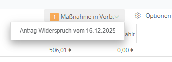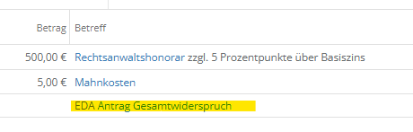 Im Forderungskonto finden Sie nun auch automatisch die Angabe, dass ein Widerspruch erhoben wurde. Durch Anklicken des EDA-Antrags können Sie jederzeit Ihre getätigten Angaben nachprüfen.