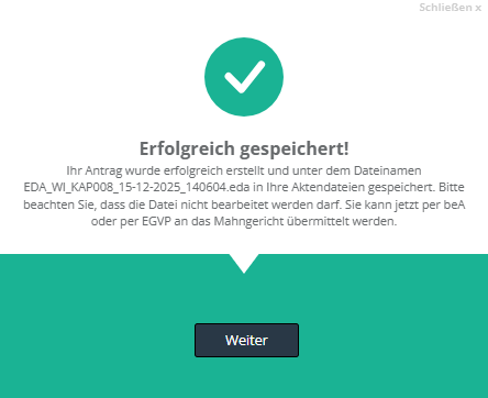 Sie geben das zuständige Zentrale Mahngericht wie im Mahnbescheid an und wählen Ihre EDA-Konfiguration aus. Klicken Sie auf „Weiter“.