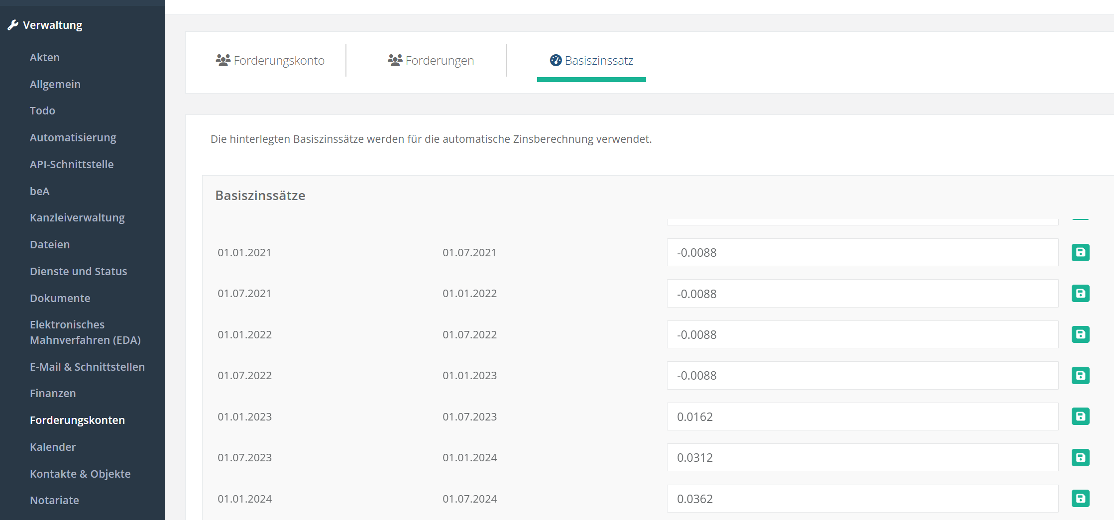 Es wird, sofern keine abweichende Einstellung von Ihnen vorgenommen wurde, der Basiszinssatz zugrunde gelegt. Einsehen und ggfs. bearbeiten können Sie diesen im Bereich „Verwaltung“ unter „Forderungskonten“. Der Basiszinssatz wird automatisch in der Software alle sechs Monate aktualisiert.