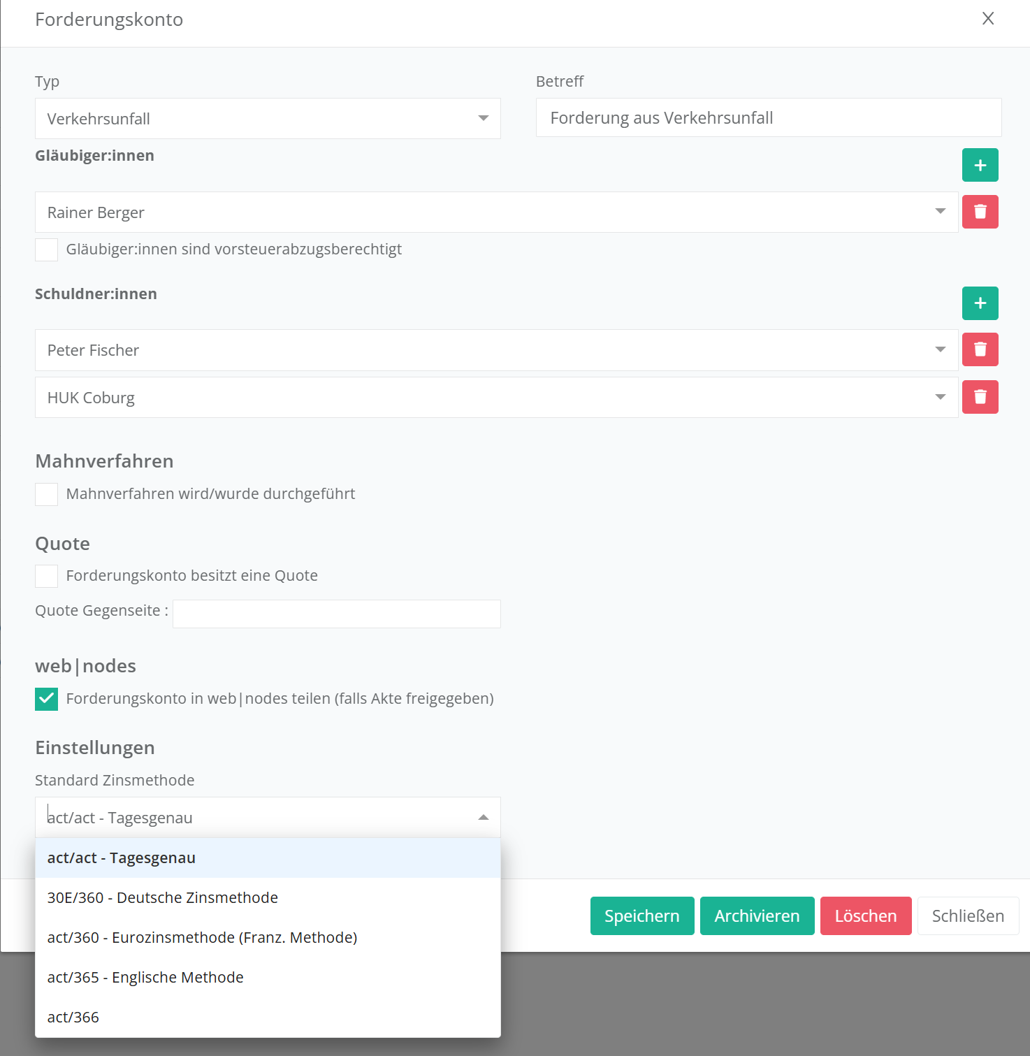 Neben den genannten Standardeinstellungen, können Sie auch bei Neuerstellung eines Forderungskonto in der Akte einstellen, welches Modell der Zinsberechnung gelten soll.