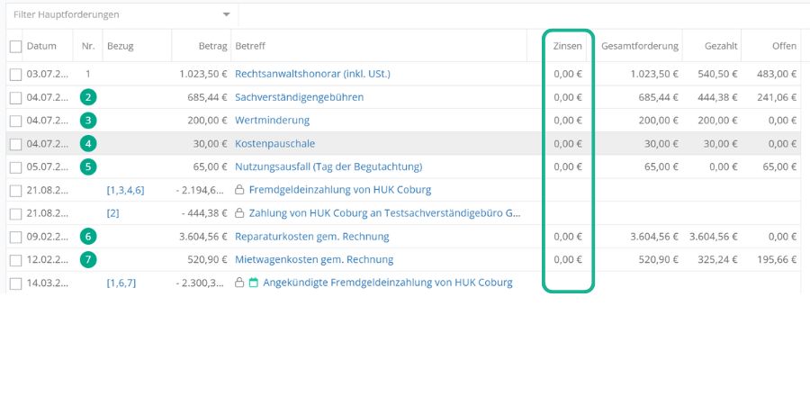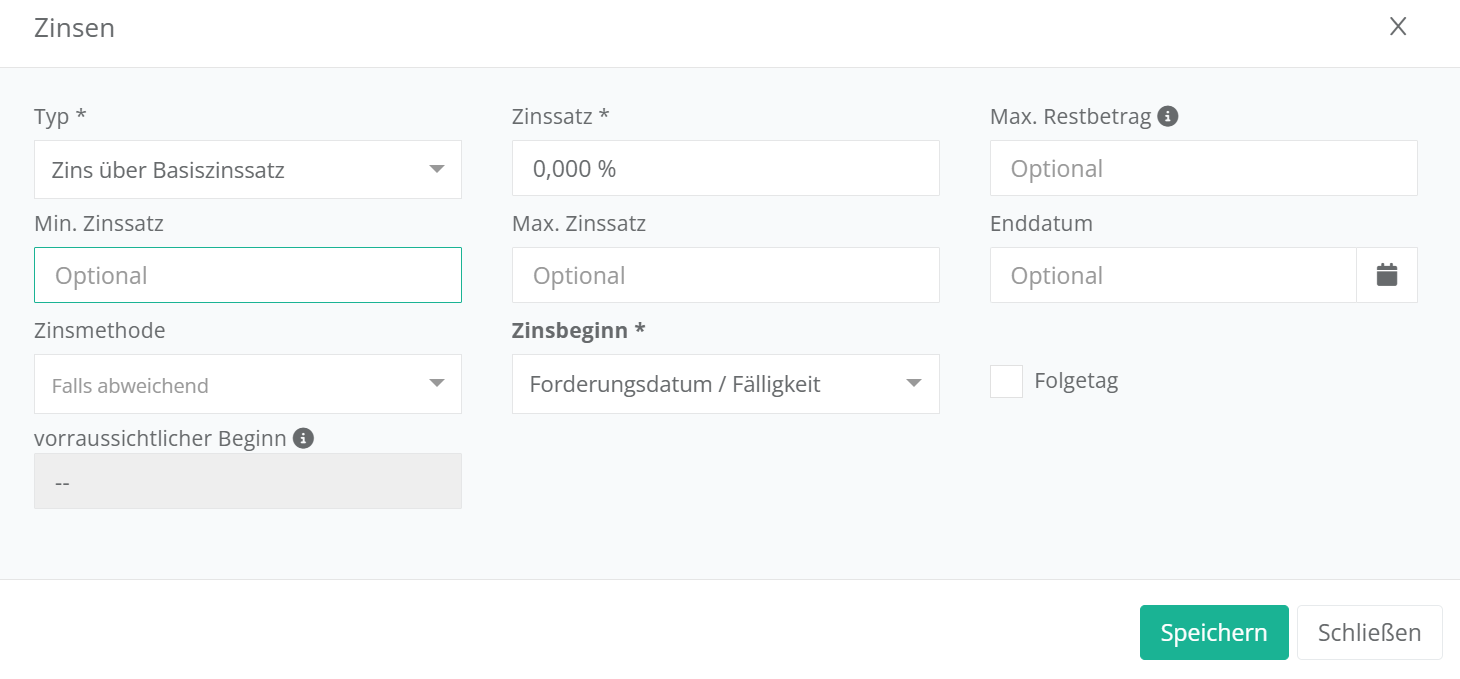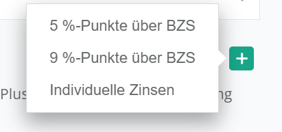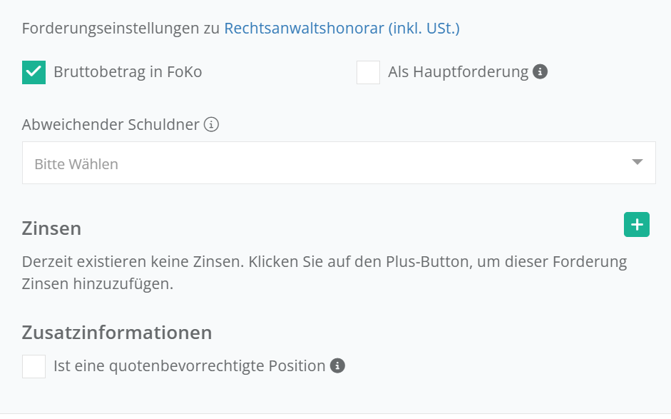 Klicken Sie dafür bei der entsprechenden Forderung (bereits erstellt oder neue Erstellung) auf den grünen Plus-Button in der Zeile mit der Überschrift „Zinsen“.